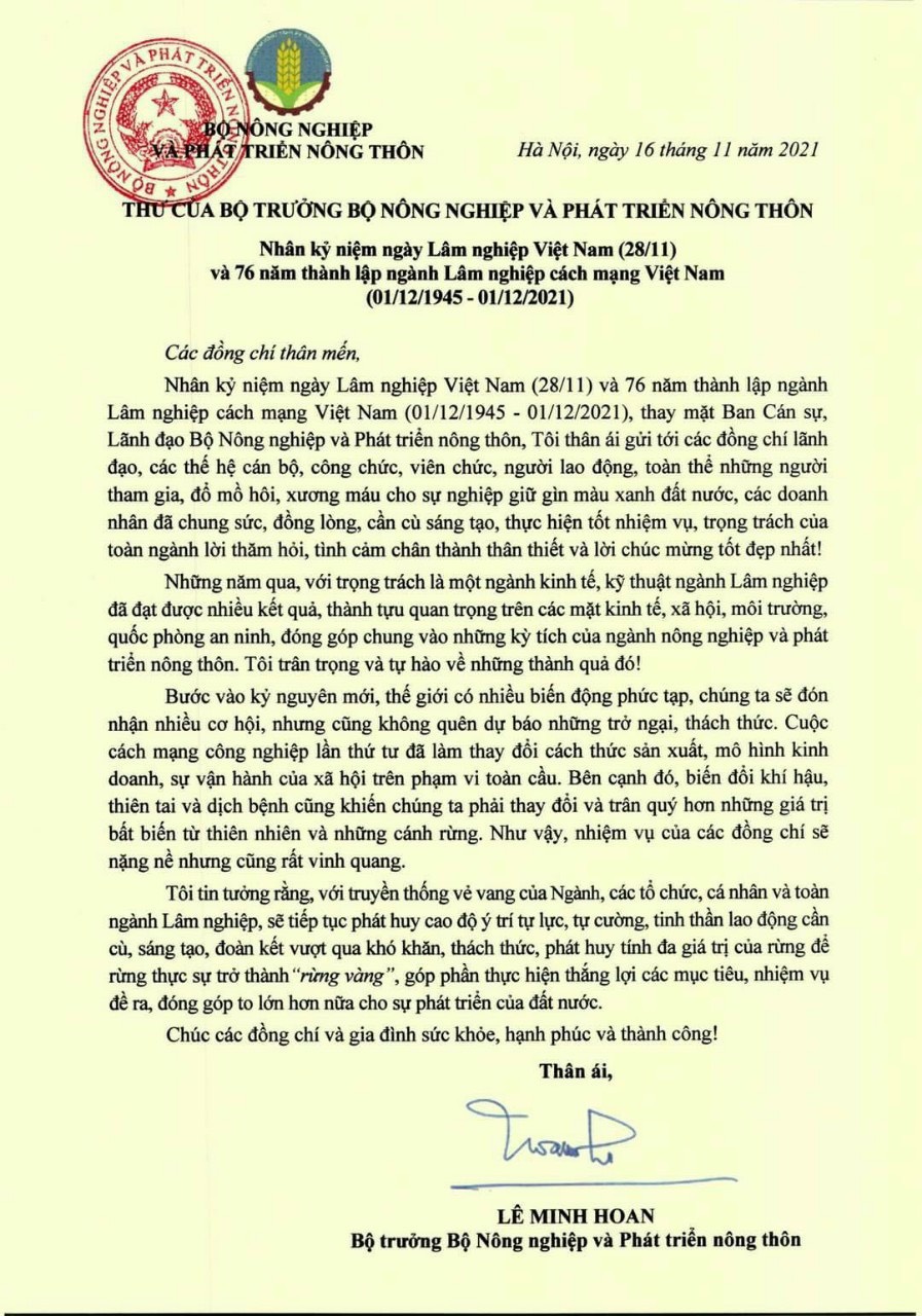 Thư chức mừng của Bộ trưởng Lê Minh Hoan nhân kỷ niệm ngày Lâm nghiệp Việt Nam (28/11) và 76 năm thành lập ngành Lâm nghiệp cách mạng Việt Nam (01/12/1945 – 01/12/2021)